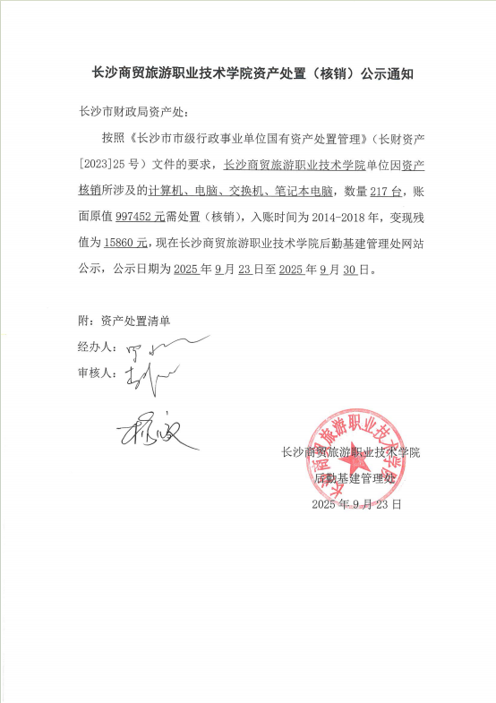 长沙商贸旅游职业技术学院资产处置(核销)公示通知