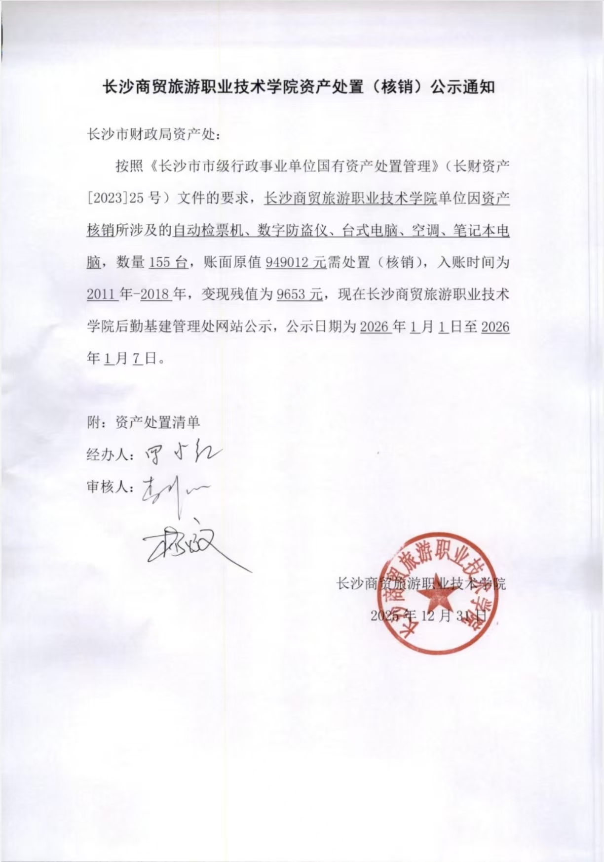 长沙商贸旅游职业技术学院资产处置(核销)公示通知